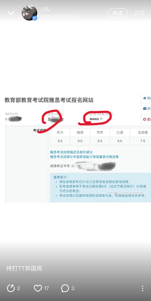 学信网中是赵同学,但是动态底下又摆着一张姓‘王’的雅思成绩单。